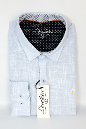 - Detalles: Cuello sport con contraste interior premium en patrón floral en tonos azules sobre fondo blanco, complementado con forro en azul cielo bajo el cuello. Botones con acentos en azul y bordado floral discreto en el pecho que añade un toque distintivo.