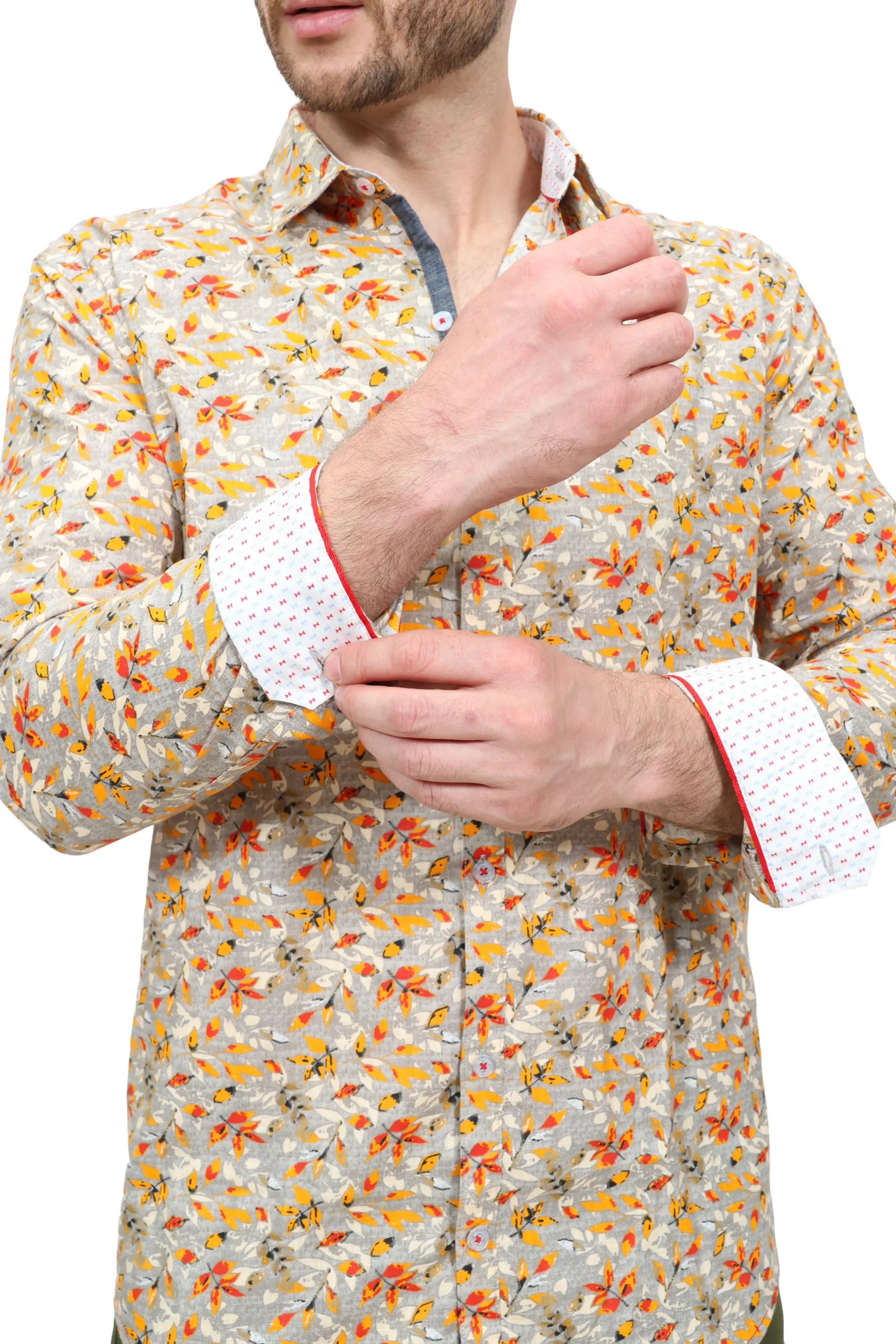 • Diseño: Estampado floral en tonos grises, naranjas y amarillos.